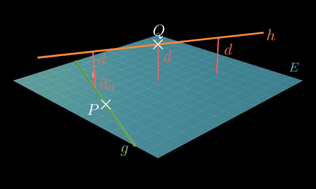 d ( E , Q ) = ∣ ( q ⃗ − p ⃗ ) ∘ n ⃗ 0 ∣ d(E, Q) = |(\vec q - \vec p)\circ\vec n_0| d ( E , Q ) = ∣ ( q − p ) ∘ n 0 ∣ 💡