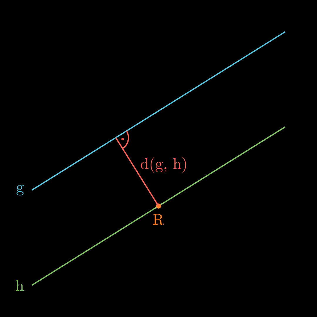 Algorithmus Stelle Hilfsebene H H H auf, die den Punkt P P P enthält und den Richtungsvektor von g g g als Normalenvektor hat. Erhalte Punkt F F F als Schnittpunkt von g g g und H H H . d ( R , g ) = ∣ F R → ∣ d(R, g) = |\overrightarrow{FR}| d ( R , g ) = ∣ FR ∣ 💡
