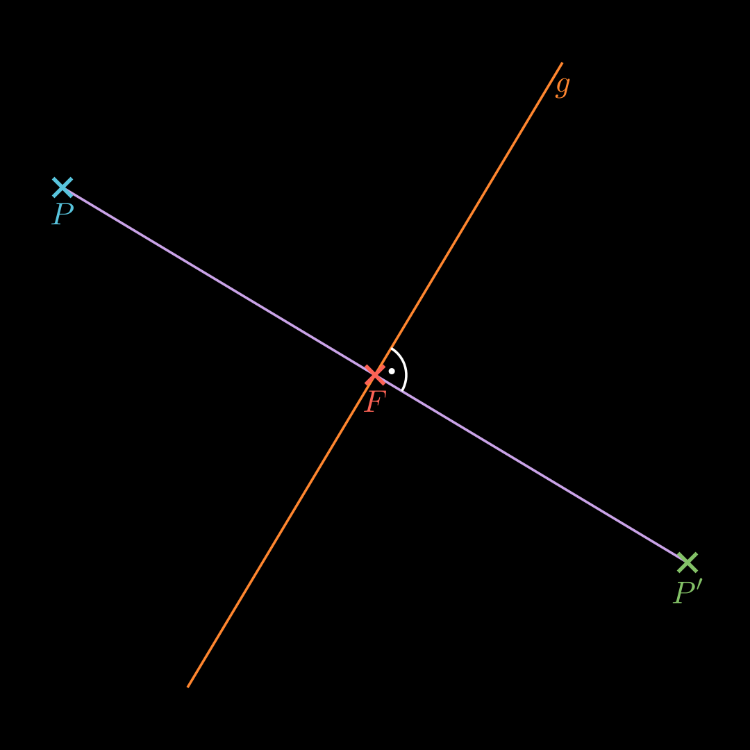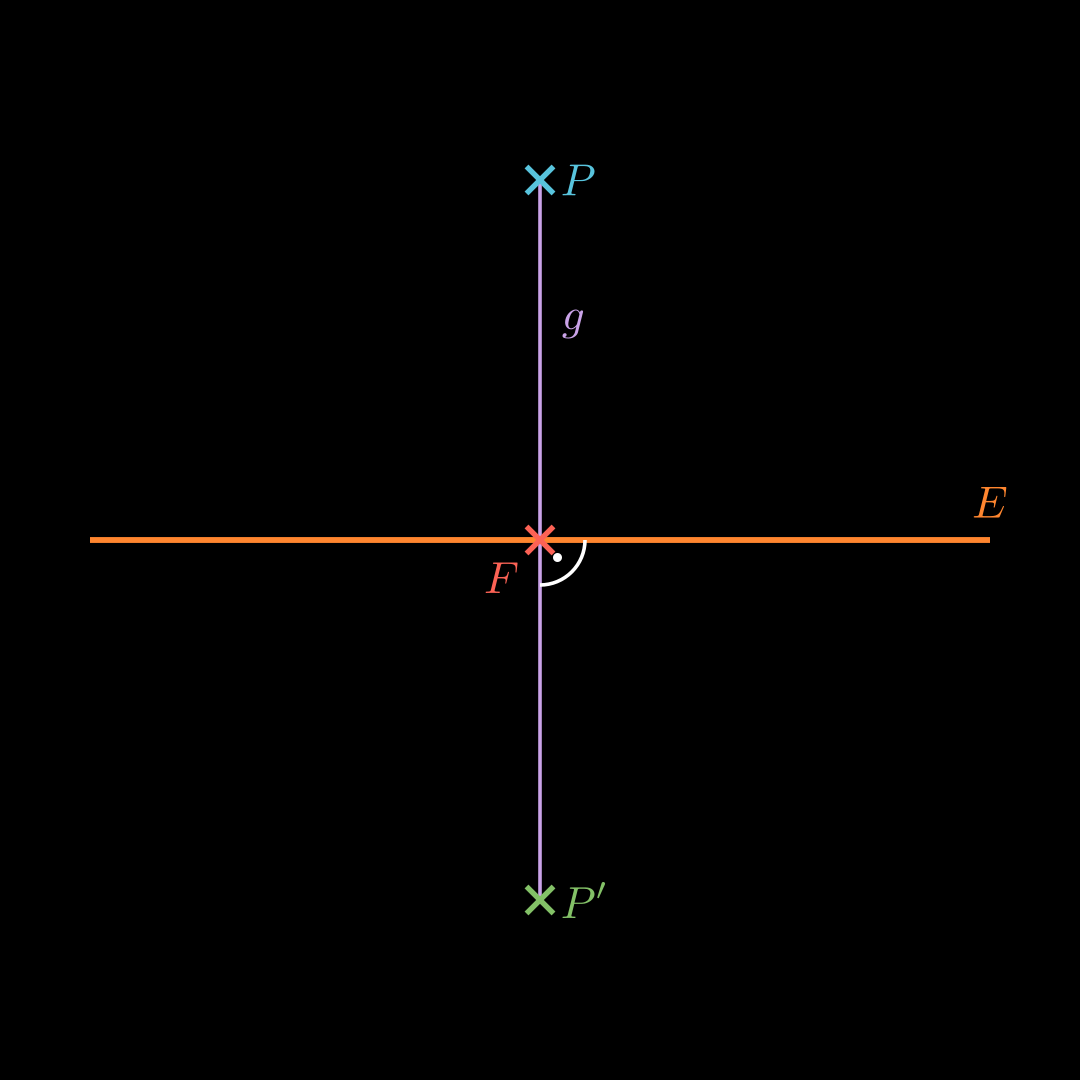 Stelle eine Hilfsebene H H H auf, die durch P P P verläuft und als Normalenvektor den Richtungsvektor von g g g hat. Erhalte den Punkt F F F als Schnittpunkt von g g g und H H H . Punktspiegelung an F F F : O P ′ → = O F → + P F → \overrightarrow{OP'} = \overrightarrow{OF} + \overrightarrow{PF} O P ′ = OF + PF An einer Ebene Spiegeln 💡
