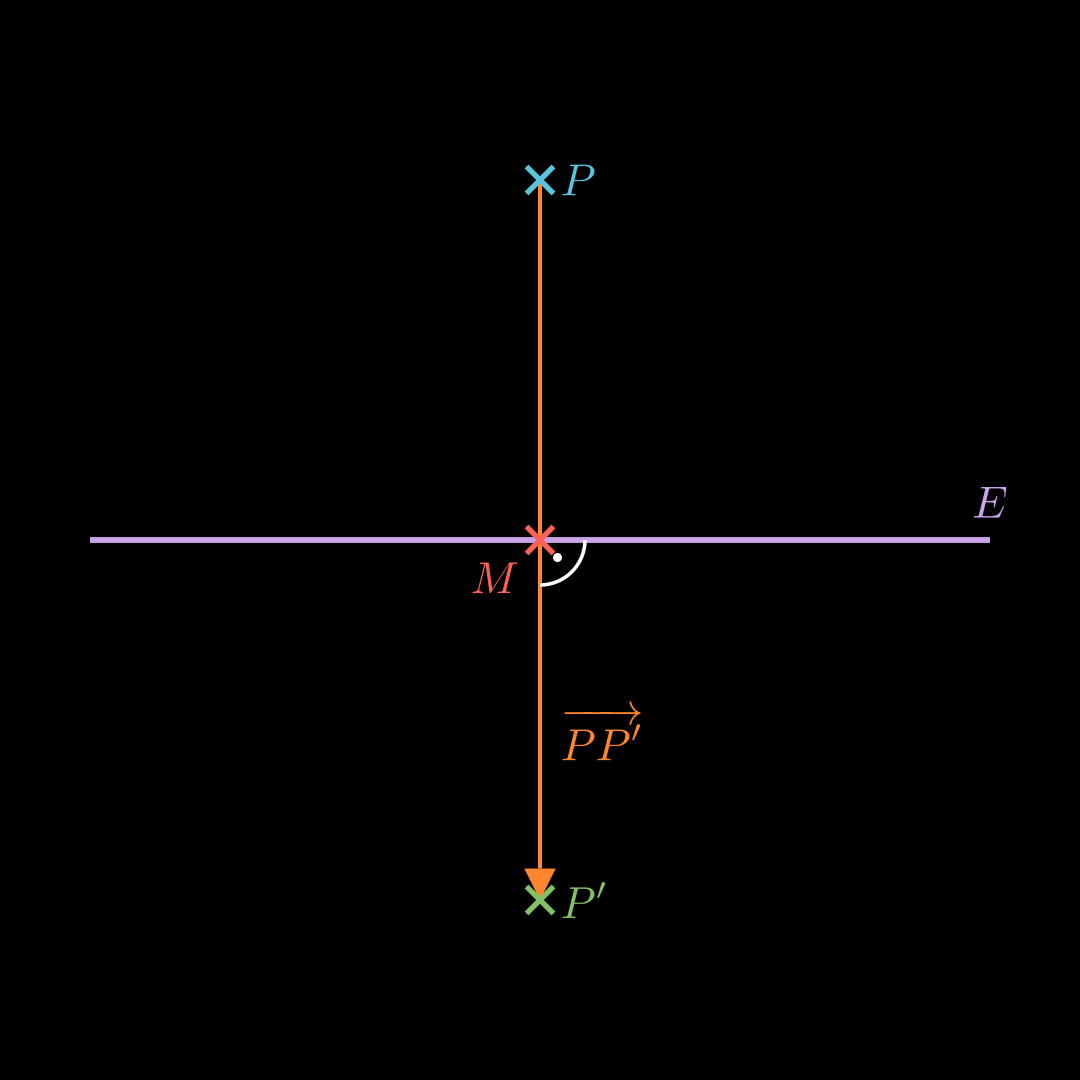Berechne den Mittelpunkt M M M von P P P und P ’ P’ P ’ . Stelle eine Gleichung für E E E auf, sodass M M M in E E E liegt und P P ′ → \overrightarrow{PP'} P P ′ der Normalenvektor von E E E ist.