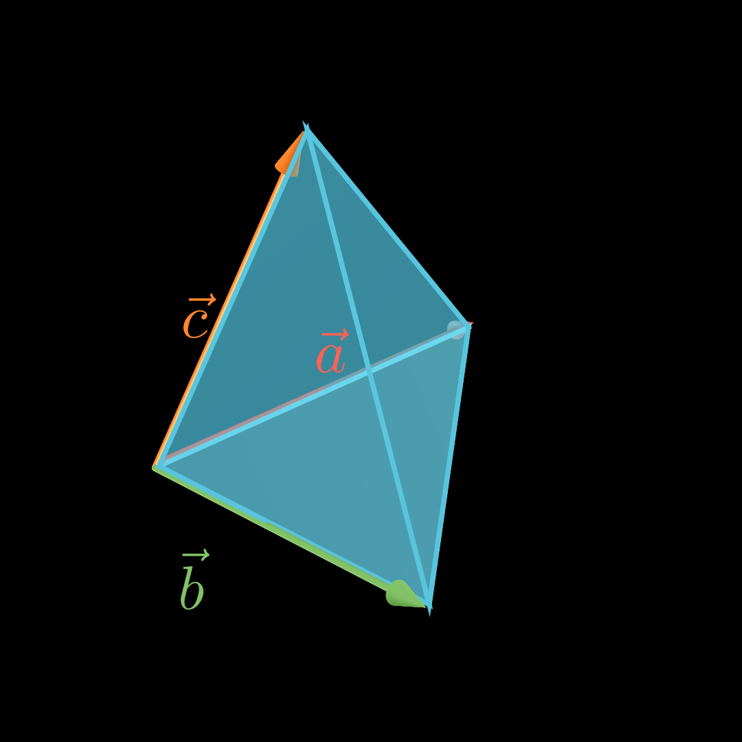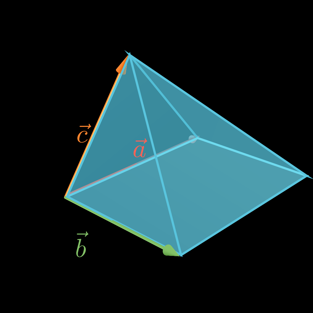 Für das Volumen V V V einer Pyramide mit dreieckiger Grundfläche, die von den Vektoren a ⃗ , b ⃗ \vec a, \vec b a , b und c ⃗ \vec c c aufgespannt wird, gilt: