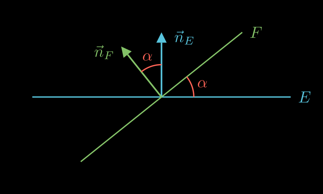 Für den Schnittwinkel zwischen zwei Ebenen E E E und F F F mit Normalenvektoren n ⃗ E \vec n_E n E und n ⃗ f \vec n_f n f gilt: