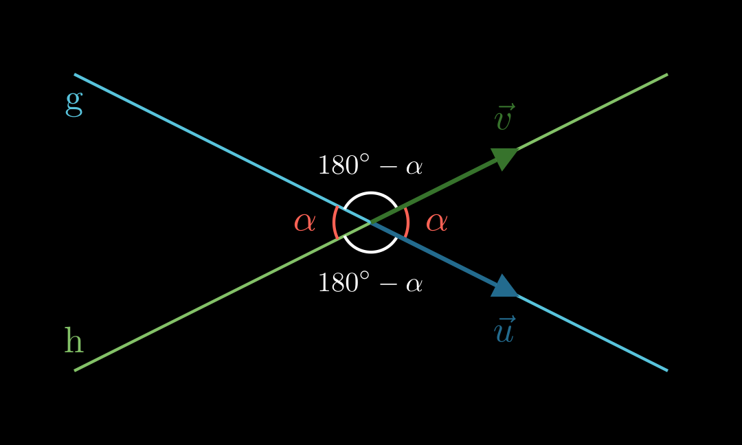Für den Schnittwinkel zwischen zwei Geraden g g g und h h h mit Richtungsvektoren u ⃗ \vec u u und v ⃗ \vec v v gilt: