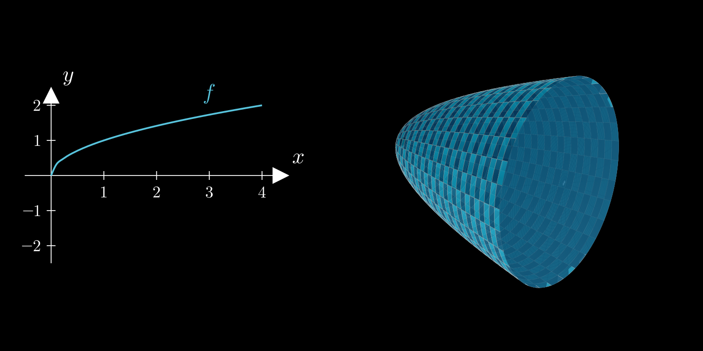 Gegeben ist ein über dem Intervall [a;b] integrierbare Funktion f. Rotiert die Fläche zwischen dem Graphen von f und der x-Achse über dem Intervall [a;b] um die x-Achse, so entsteht ein Rotationskörper. Sein Volumen V berechnet man mit