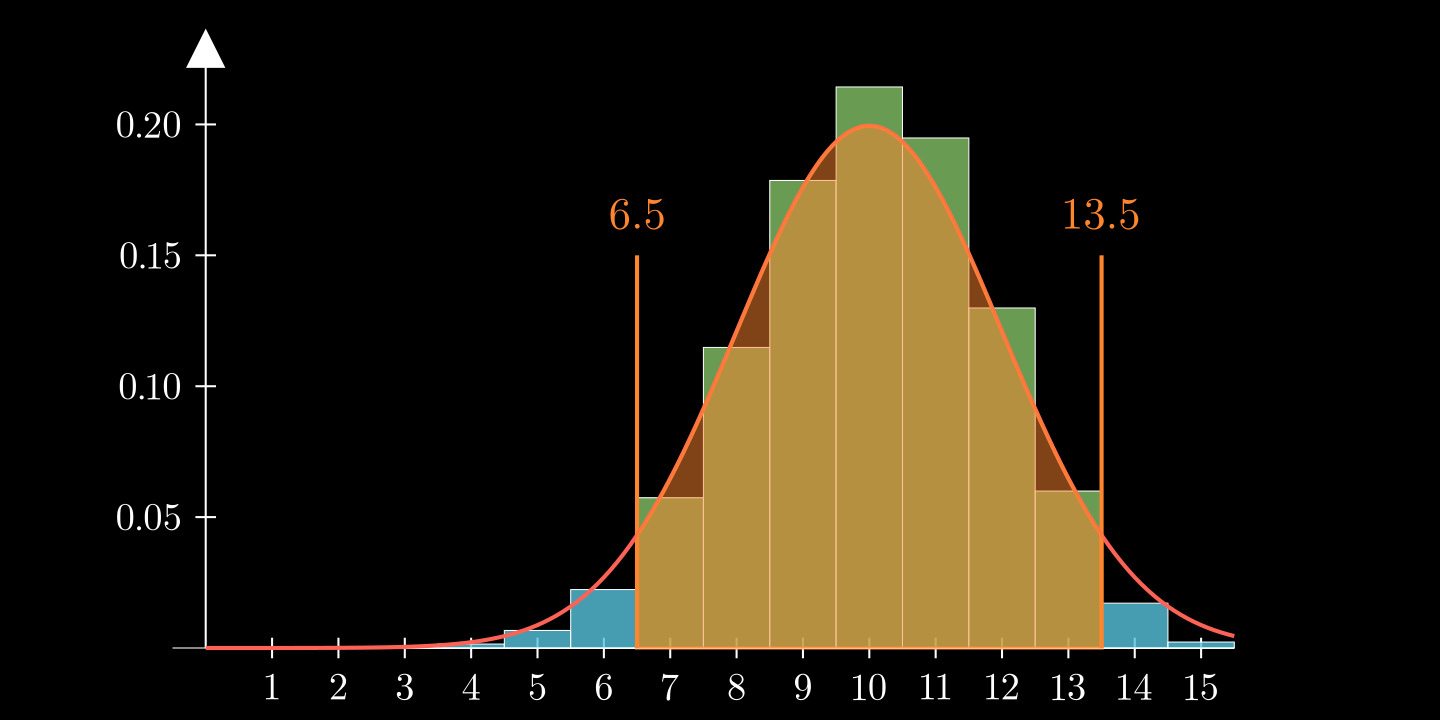 Nutzt man die Normalverteilung um die Wahrscheinlichkeit für eine diskrete Zufallsgröße näherungsweise zu bestimmen, muss man die Integralgrenzen entsprechend anpassen.